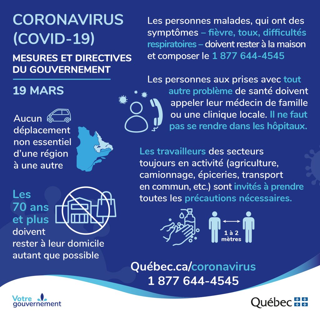 Le premier ministre, M. François Legault, a appelé les citoyens à éviter les déplacements non essentiels d’une région à l’autre. Bien que la situation soit sous contrôle et que les mesures mises en place par les autorités de la santé publique portent leurs fruits, il faut tout faire pour éviter de propager le virus d’une région à l’autre. « Il ne faut pas lâcher », a insisté M. Legault.