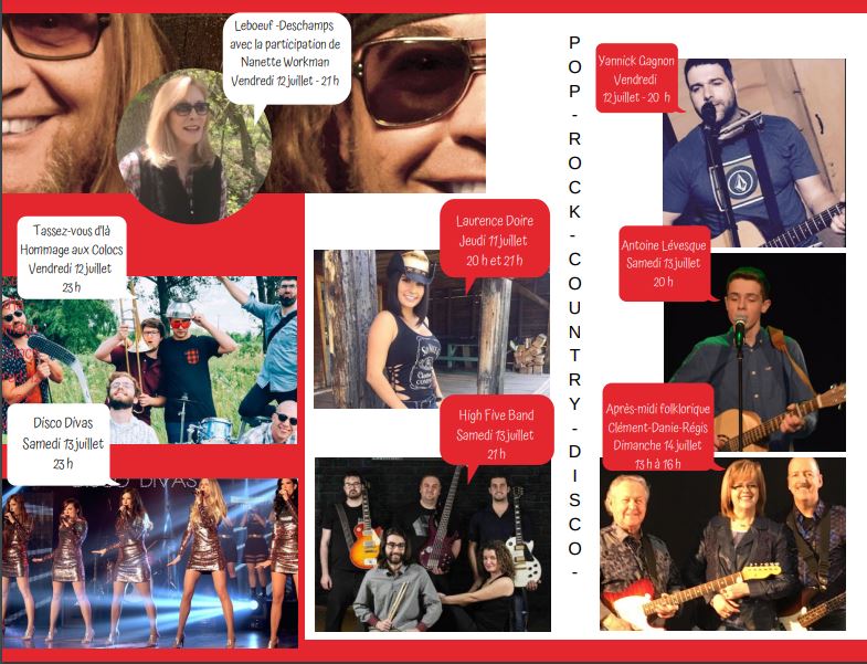 La soirée du samedi s’annonce dansante avec Disco Divas, qui réunit sur scène cinq des meilleures chanteuses du Québec dans un spectacle unique Hommage aux années disco. Le groupe se produira à 23 h. Il sera précédé à 20 h d’Antoine Lévesque, participant au Festival de la chanson de Granby, qui a également fait un passage à l’émission La Voix, et à 21 h du groupe High Five Band formé de musiciens de la région.