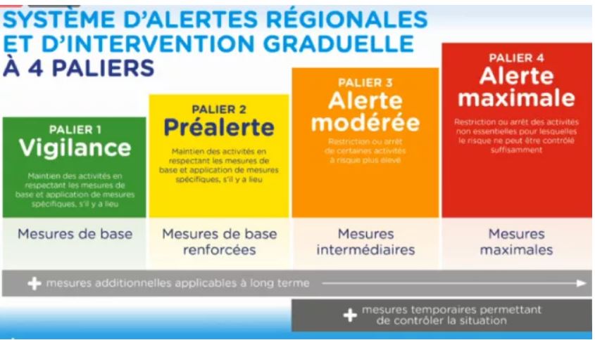 Rappelons que le système d’alertes régionales vise à limiter les impacts sanitaires, sociaux et économiques de la COVID‑ 19, à protéger les personnes les plus vulnérables et à éviter de surcharger le système de soins. Des mesures visant à réviser l’offre de service pourraient être prises si la situation le commandait.