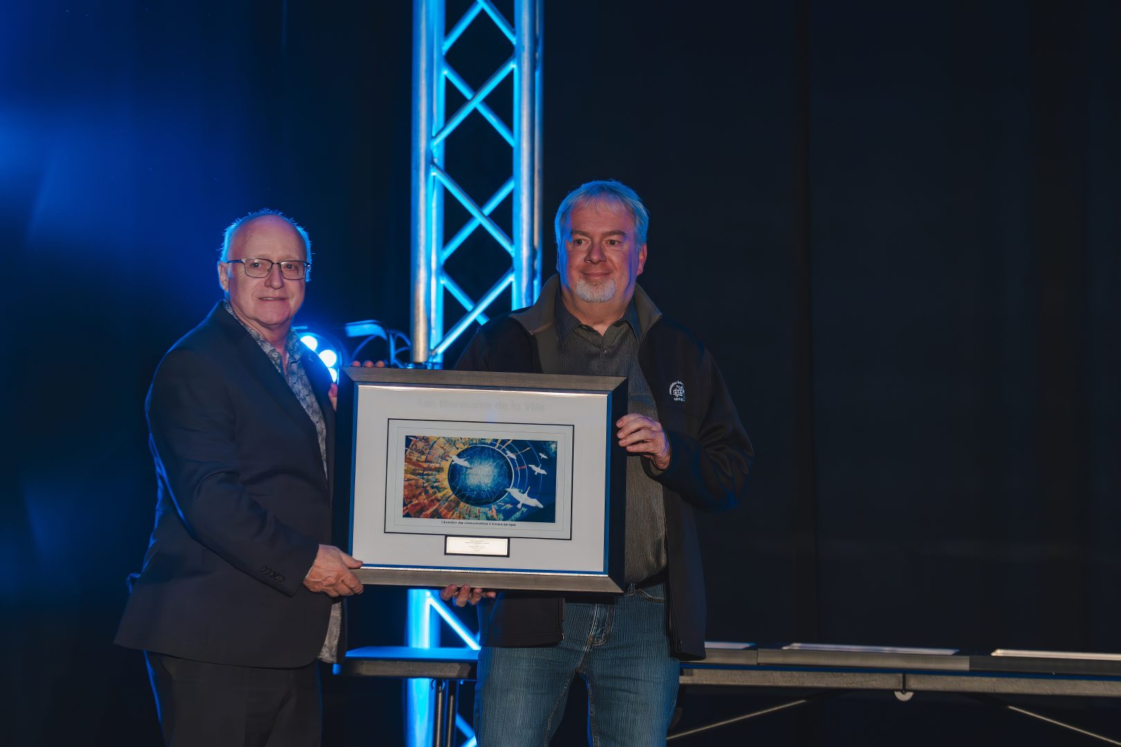 Alain Samson, lauréat du Mérite municipal – implication bénévole – citoyen, reçoit son prix des mains du conseiller municipal Gilles Lavoie. Crédit photo: Maxime Amyot