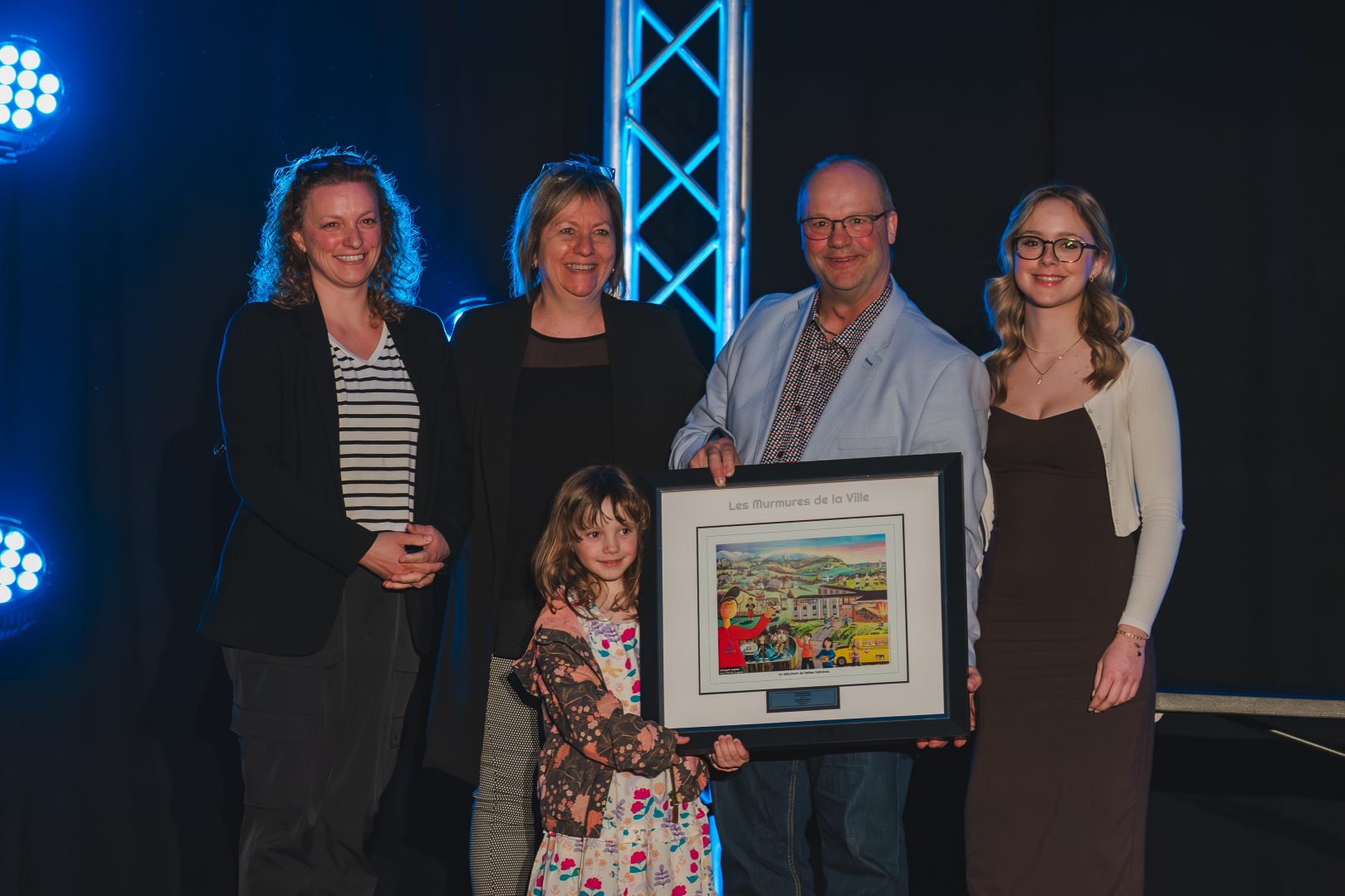 Les enseignantes Josée Plante, Noëlline Banville, l’élève Camille Berthelot et la jeune relève (fille de Josée) acceptent le prix Coup de coeur des mains du maire Martin Soucy. Crédit photo: Maxime Amyot
