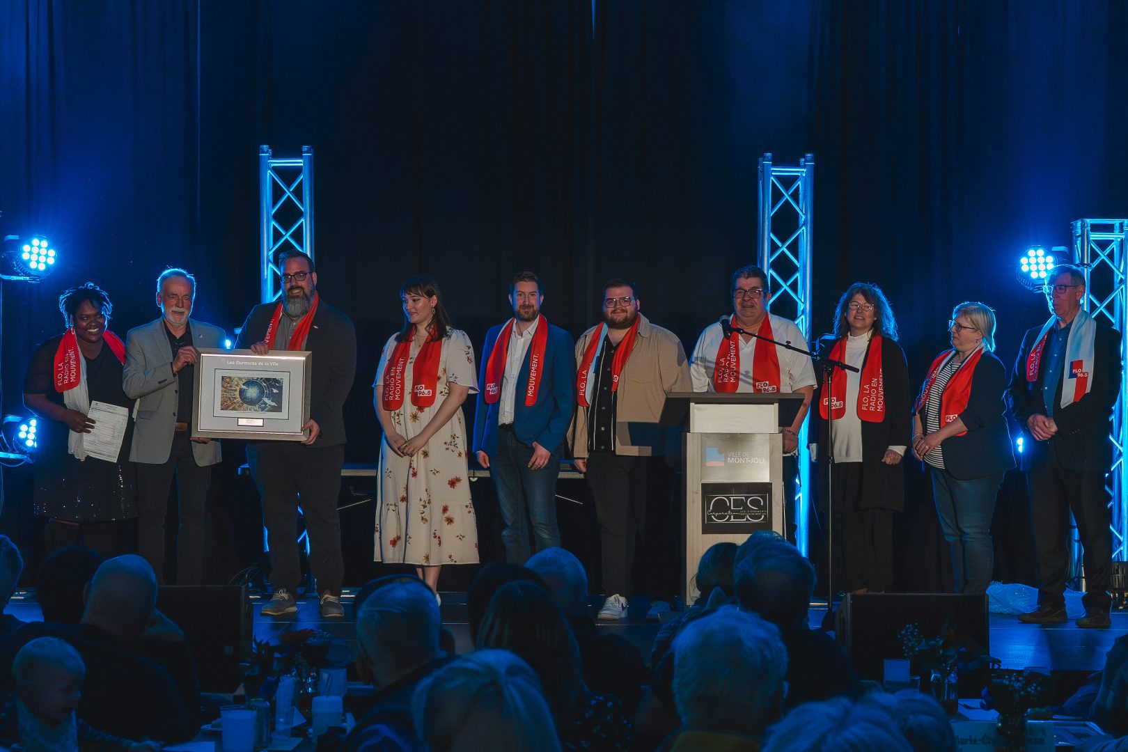 Kédina Fleury Samson, directrice générale et Vincent Dufour, président de FLO FM, reçoivent leur prix des mains du conseiller municipal Robin Guy. Ils sont accompagnés d’une partie de l’équipe la radio communautaire. Crédit photo: Maxime Amyot