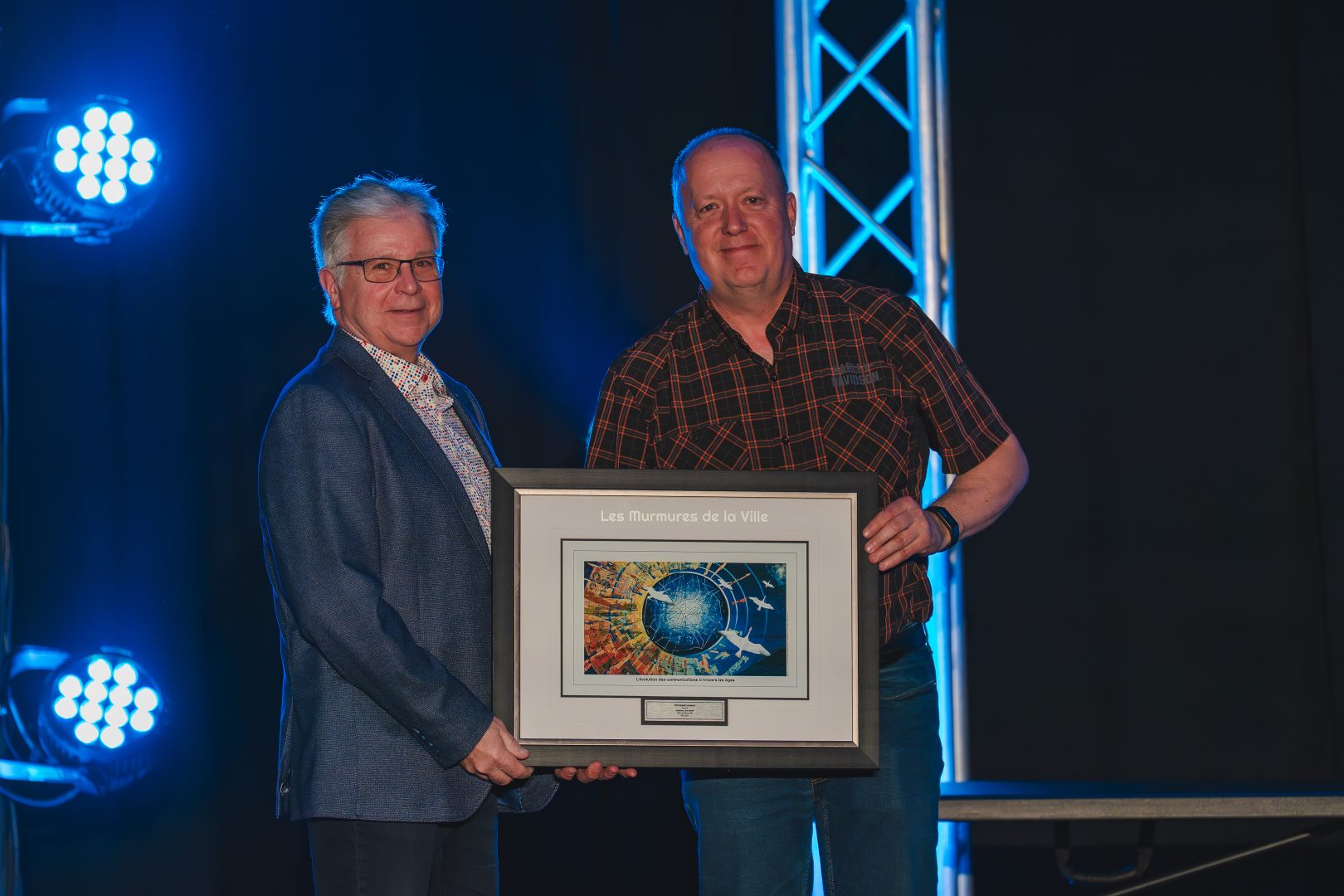 Au nom de sa conjointe Lise Bossé, retenue à l’extérieur, Carmain Laporte (à droite) a accepté le prix Robert-Dumais, des mains du conseiller municipal Alain Thibault. Crédit photo: Maxime Amyot