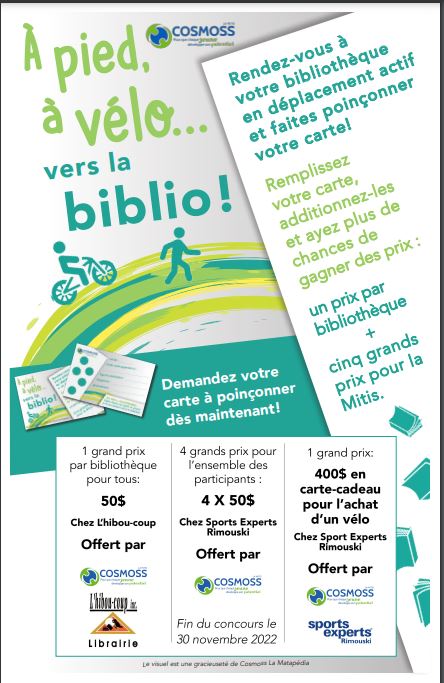 Mont-Joli, le 28 avril 2022 – Du 1er mai au 30 novembre, les jeunes âgés de 0 à 30 ans sont invités à participer au concours À pied, à vélo vers la biblio ! Cette initiative issue du comité littératie et numératie de COSMOSS (Communauté ouverte et solidaire pour un monde outillé, scolarisé et en santé) a pour but de combiner le plaisir de la lecture et les bienfaits de la santé physique. À pied, à vélo vers la biblio ! est inspiré d’autres projets semblables au Québec et plus particulièrement celui de la Matapédia.