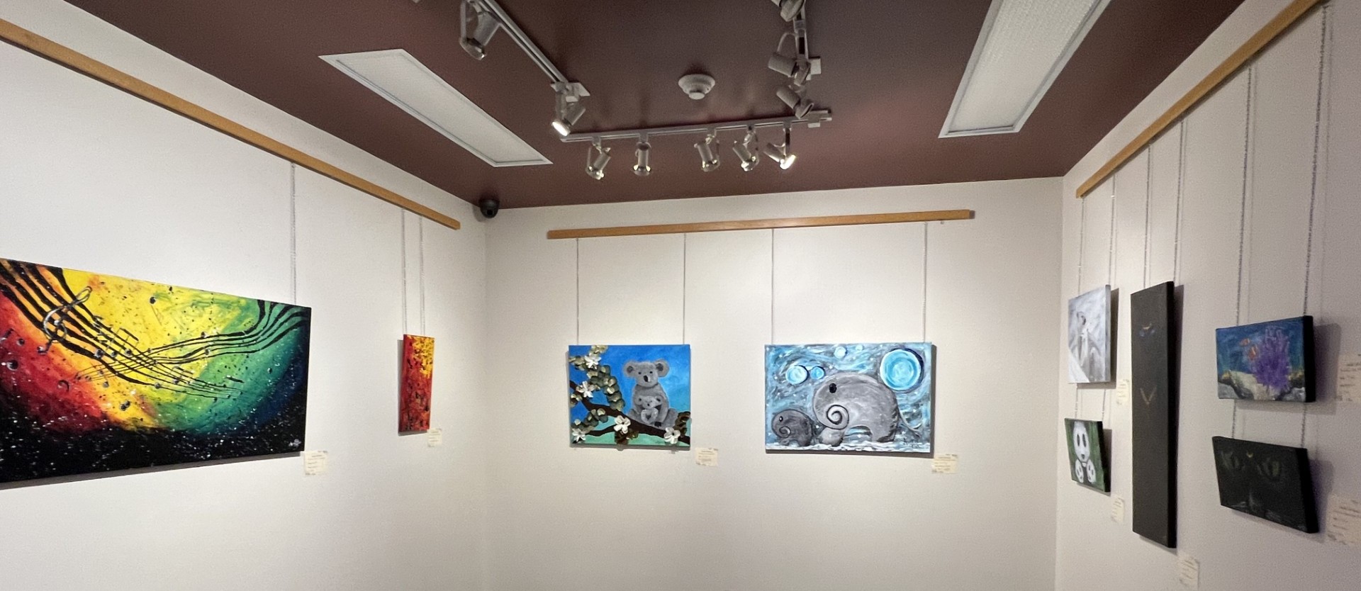 Dans cette exposition très libre, on peut voir une maman animale et son petit, un paysage sous-marin ou une ville éclairée par la lune, des notes de musique dansant dans un tourbillon de couleurs, bref une variété de toiles créées selon l’inspiration du moment.