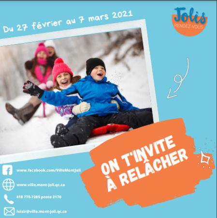 Mont-Joli, le 19 février 2021 – On ne s’ennuiera pas à la relâche scolaire à Mont-Joli. Le Service des loisirs, de la culture et de la vie communautaire a mis au point une programmation d’activités variées qui sauront plaire au plus grand nombre. Le thème de la semaine : On t’invite à relâcher !